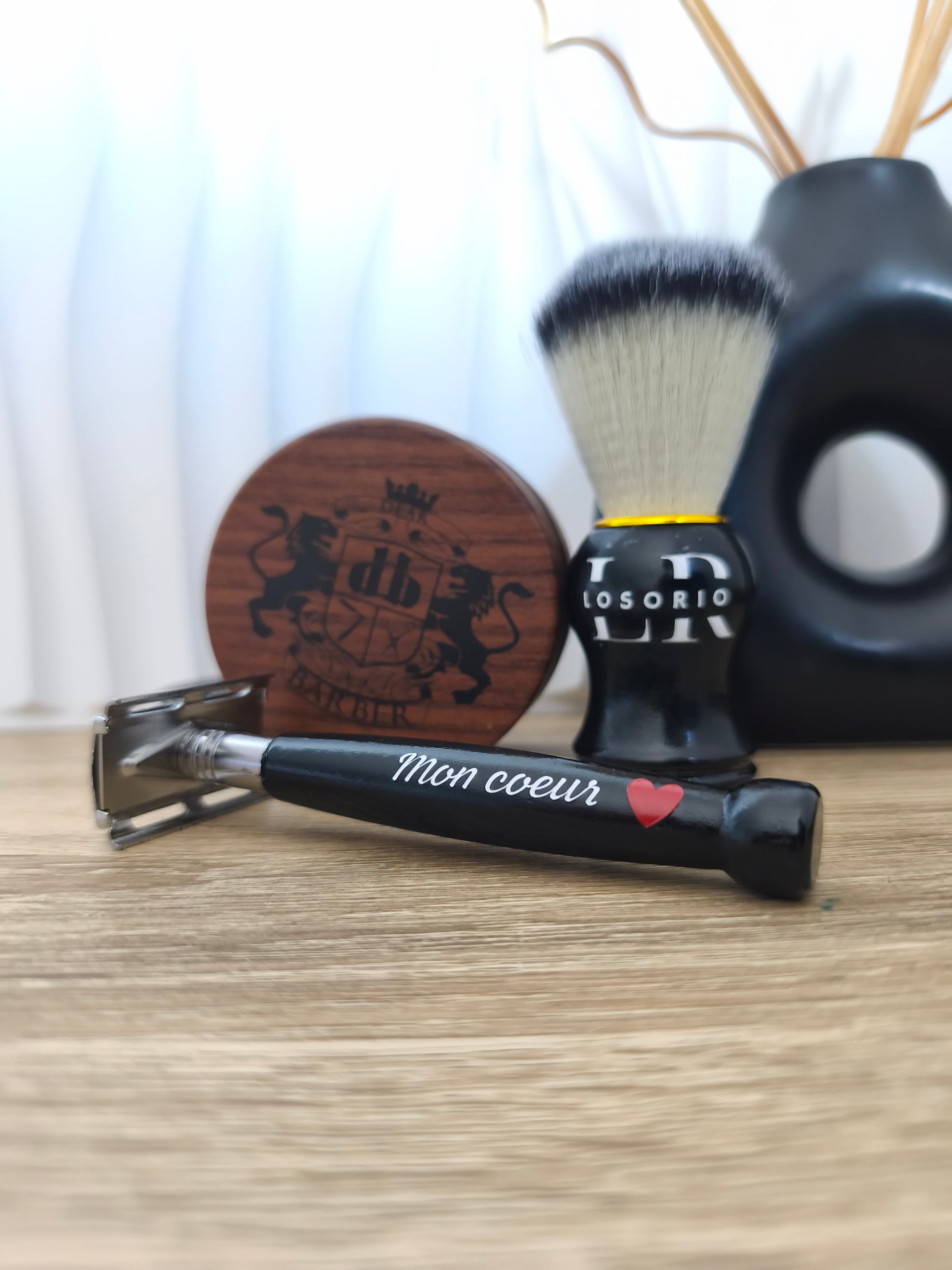 Le rasoir de sûreté en bois garantit un rasage précis et confortable, grâce à sa légèreté qui facilite la prise en main et réduit la fatigue du poignet. Le blaireau en nylon permet de créer une mousse riche et onctueuse avec la crème de rasage, stimulant délicatement la peau pour une sensation de fraîcheur et de douceur. La crème de rasage Dear Barber assure une glisse optimale, hydrate la peau en profondeur, et aide à prévenir les irritations pour un confort durable.